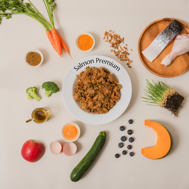 Our Salmon Premium recipe is a nutrient dense and natural option for dogs. Muscle meat provides high-quality protein, offal is a rich source of essential vitamins and minerals while bone provides our dogs with calcium, marrow and collagen to promote strong teeth and bones, as well as a healthy skin and coat.